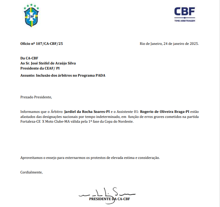 Após protesto e pedido de providências apresentados pelo presidente da Federação Maranhense de Futebol, Antônio Américo, junto à Comissão de Arbitragem da CBF, esta prontamente acolheu os argumentos e afastou, por tempo indeterminado, o árbitro e o assistente 1 da partida Fortaleza X Moto, válida pela Copa do Nordeste.