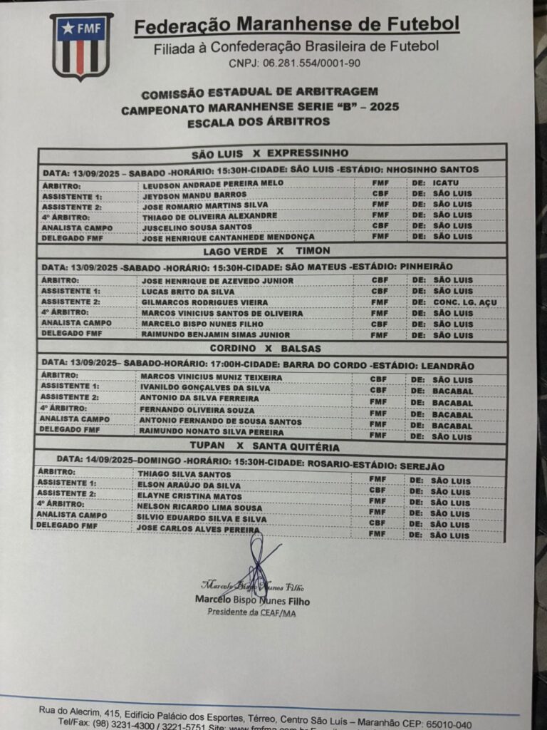 A comissão estadual de arbitragem de futebol do estado do Maranhão ( CEAF-MA), definiu nesta quarta-feira (10), a arbitragem para os jogos da primeira rodada da Série B do Campeonato Maranhense 2025.