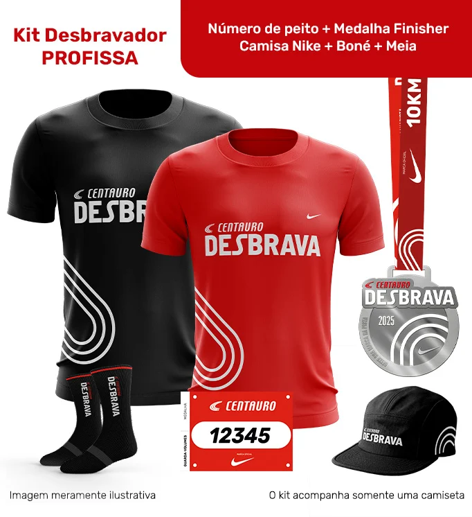 • Kit Desbravador Profissa (R$ 209,90), por sua vez, oferece o pacote completo: camiseta Nike, um par de meias, boné, número de peito e medalha.