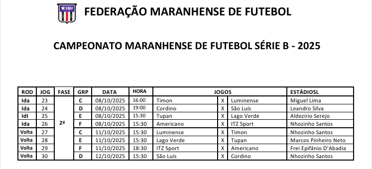 A Federação Maranhense de Futebol ( FMF), divulgou nesta segunda-feira (6), a tabela de jogos da fase quartas de final da Série B do Campeonato Maranhense 2025. As partidas acontecem nos dias 8, 11 e 12