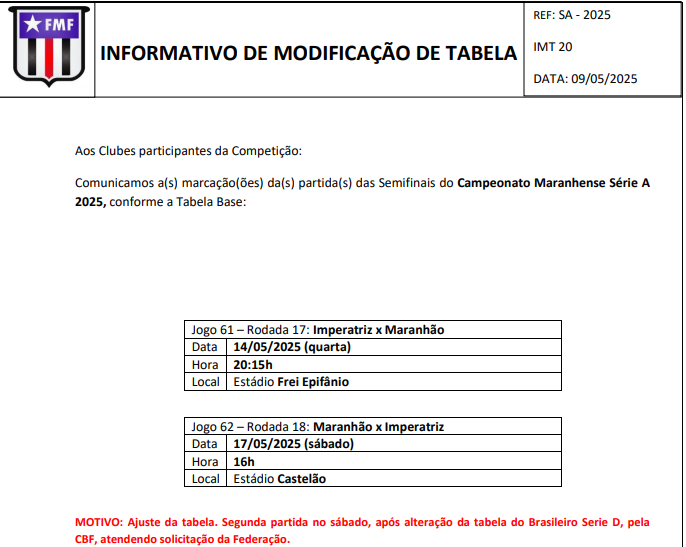 A Federação Maranhense de Futebol ( FMF) definiu nesta sexta-feira (9), as datas e horários das partidas decisivas do Campeonato Maranhense 2025, entre Maranhão x Imperatriz..