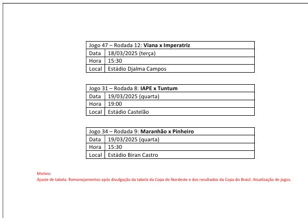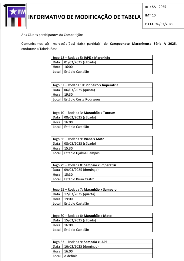 A Federação Maranhense de Futebol ( FMF), divulgou nesta quarta-feira (26), ajustes na tabela de jogos do Campeonato Maranhense 2025. De acordo com a FMF, os ajustes foram feitos após divulgação dos jogos da Copa do Nordeste e dos resultados da Copa do Brasil.