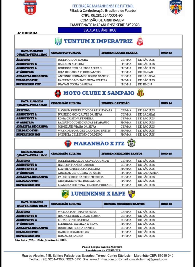 A Comissão estadual de arbitragem de futebol do estado do Maranhão ( CEAF-MA), divulgou nesta segunda-feira (14), a escala de árbitros dos jogos da quarta rodada do Campeonato Maranhense 2026.