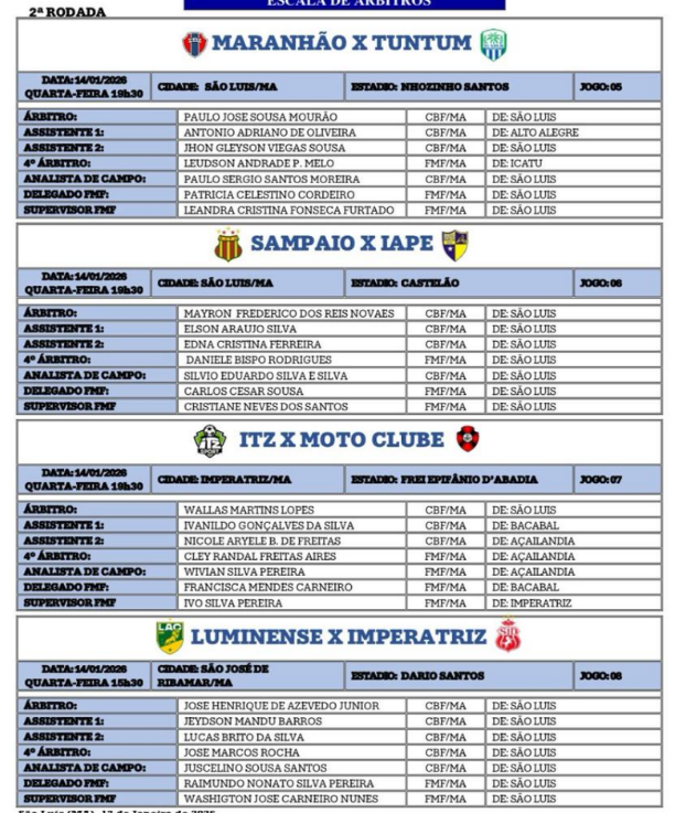 A comissão estadual de arbitragem de futebol do estado do Maranhão ( CEAF-MA), definiu nesta segunda-feira (12), a arbitragem para os jolgos da segunda rodada do Campeonato Maranhense 2026, que serão realizadosna próxima quarta-feira (14);