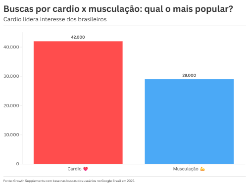 Para entender o interesse dos brasileiros que praticam atividades físicas, a Growth Supplements, empresa líder em suplementação, nutrição e moda esportiva, conduziu um estudo na base de buscas do Google. Durante todo o mês de agosto, foram observadas as variações de consultas entre cardio e musculação, e o primeiro foi o mais pesquisado.