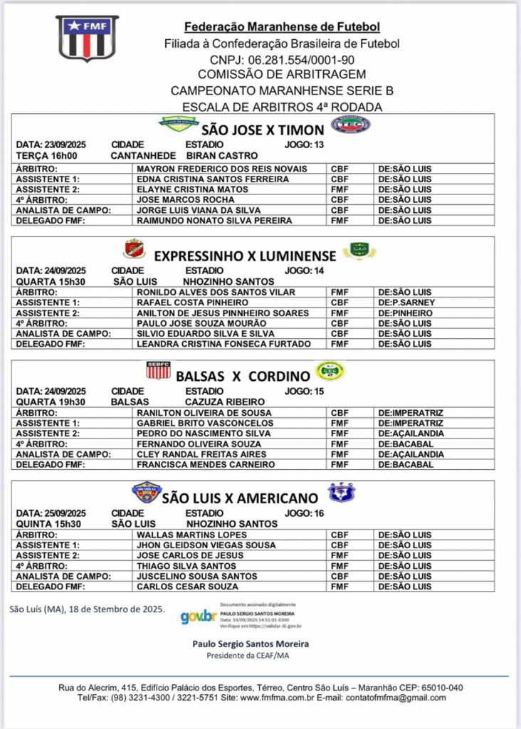 Confira a arbitragem para os jogos da 4º rodada da Série B do Campeonato Maranhense.